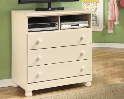 Easily store away their games and electronics in this media cabinet with 3 drawers and 2 open cubbies. The Cottage Retreat youth bedroom collection takes early American country design to create a fun and inviting cottage retreat perfect for any childs bedroom. The Cottage Retreat B213-46 Five Drawer Chest By Ashley Furniture features. Cream white media chest is ready for instant enjoyment.