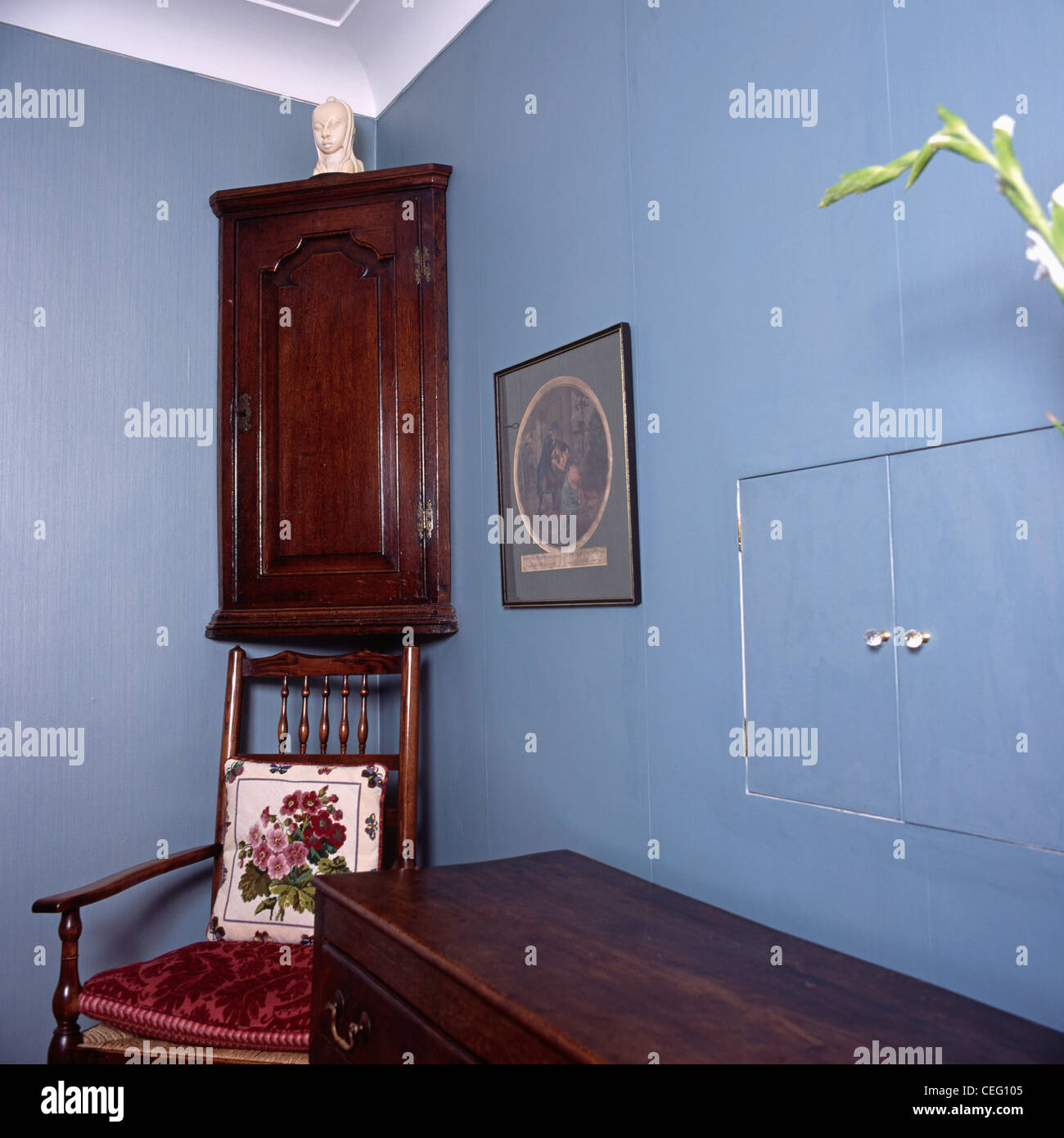 Antique Corner Cupboard Above Chair In Blue Dining Room With Wall Hatch Stock Photo Alamy