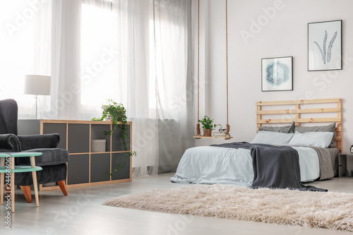 Fluffy White Carpet On The Floor Of Trendy Bedroom With King Size Bed With Wooden Headboard Posters On The Wall And Fashionable Swing As Nightstand Stock Photo Adobe Stock